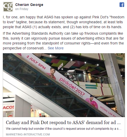 The above post is by highly learned media academic Cherian George, who has stuck one into ASAS. This is because, out of all the complaints the organisation could have acted upon, it picked the most frivolous one.