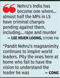 - “Nehru’s India has become one where, according to media reports, almost half the MPs in the Lok Sabha have criminal charges pending against them, including charges of rape and murder. Though it is also said that many of these allegations are politically motivated,” he had said.